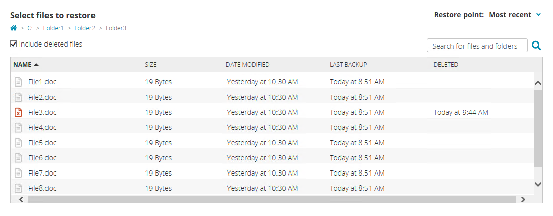 Enable Include deleted files to view items that have been deleted from your device but are still on the vault. When enabled, this option also shows files that are still on the vault that were once included in your backup rules but are now removed from the backup rules.